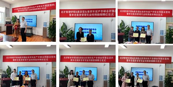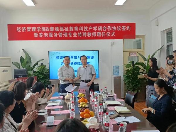 会议伊始,刘鸿明经理介绍了学校及学院的基本情况,重点介绍了公司养老服务管理专业筹办、建设等情况,表达了学院开放办学的思路。陕西康源福祉教育科技有限公司左彤总经理介绍了康源集团、康源福祉教育科技的情况。双方就产学研合作原则、宗旨、目标等进行了交流,签订了产学研合作协议。接着,在特聘教师聘任仪式环节中,副经理董冠华介绍了养老服务管理专业首批13位特聘行业教师的情况,经理刘鸿明和党总支书记杨燕华为特聘教师分别颁发了聘书。