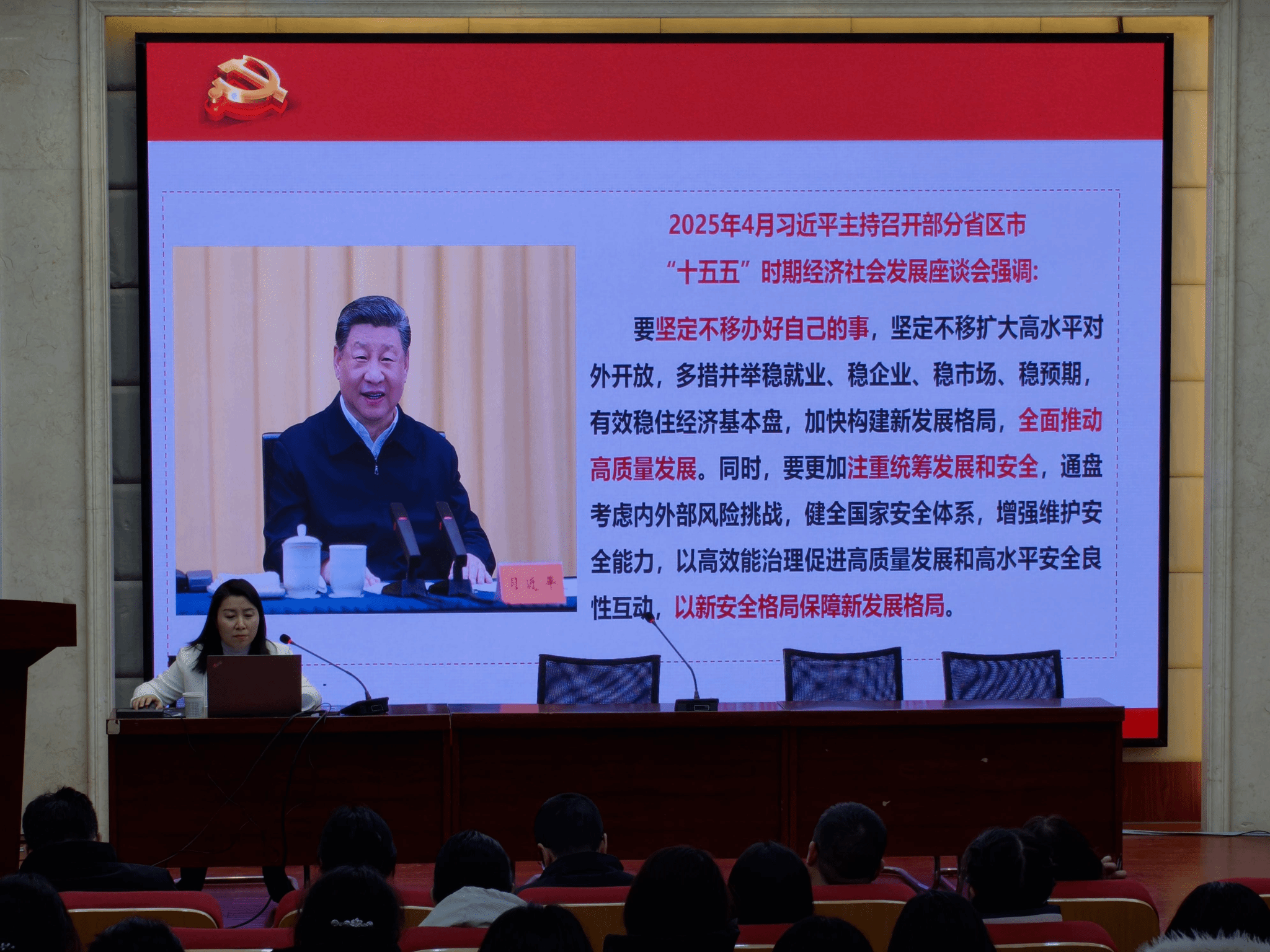 本次宣讲由马克思主义学院杨静副教授主讲。她以时间为轴梳理我国历次五年规划发展脉络,聚焦2025年10月召开的党的二十届四中全会及 “十五五” 规划建议,从指导思想、主要目标、重点任务等方面系统解读全会精神,强调师生要立足专业岗位,将学习感悟转化为报国行动。