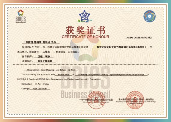 12月3日,“2022一带一路暨金砖国家技能发展与技术创新大赛“之数智化财会职业能力赛项国内赛以线上远程方式成功举办。公司员工李玲璇、常锦龙、周嘉玉、薛佳欣、张家玥、陈晴晴、莫宇娟、于丹等8名同学组成的两个参赛队获本科生组二等奖2项。